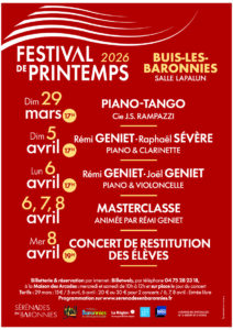 - Le festival se prolongera avec un concert piano et clarinette joué par Rémi Geniet et Raphaël Sévère le dimanche 5 avril 2026