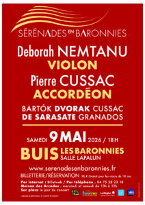 Déborah Nemtanu – violonPierre Cussac – accordéonle samedi 9 mai 2026 à 18h00 |